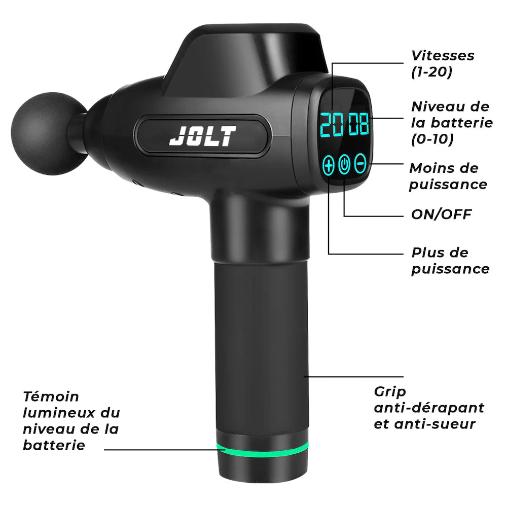 JOLT™ Bolt est un pistolet de massage dernier-cri qui aide à relaxer vos muscles endoloris ou courbaturés et permet de rétablir votre mobilité. Le JOLT™ Bolt a été conçu et développé par notre équipe, avec l’appui de professionnels du sport et de la médecine.