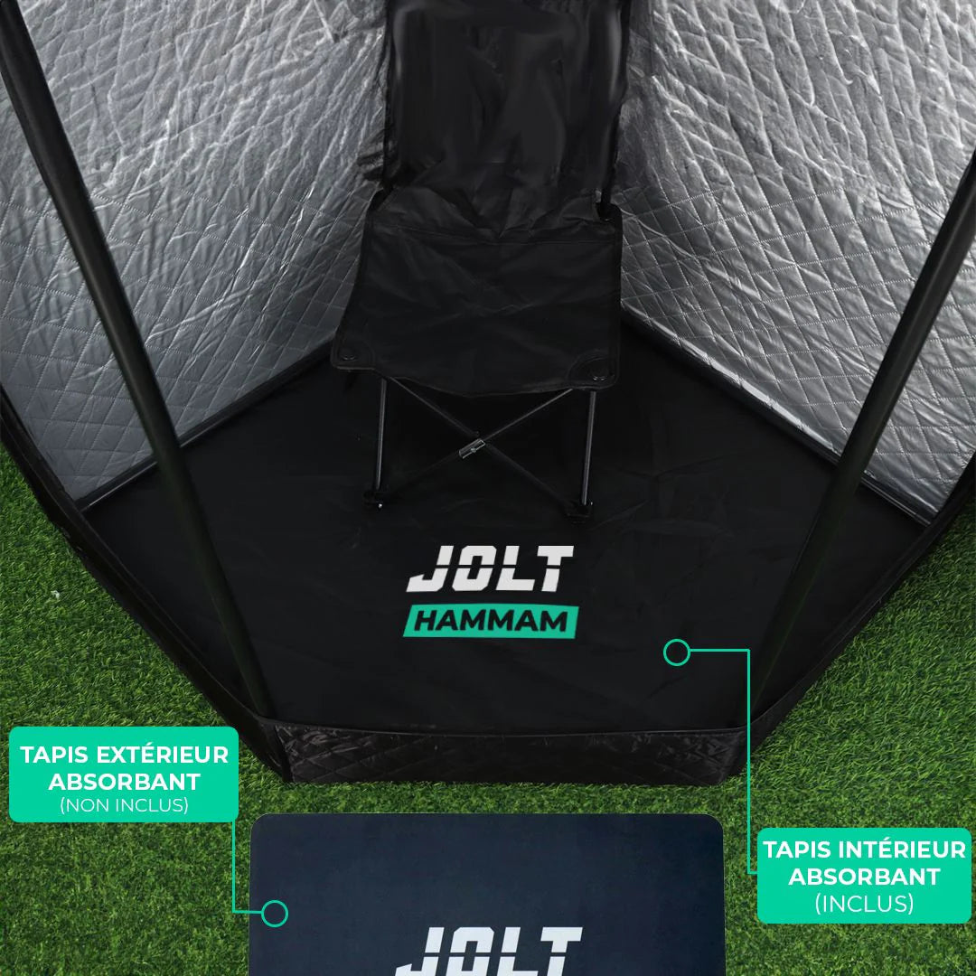 JOLT Hammam a été soigneusement conçu avec des matériaux de qualité. La tente isolée de qualité supérieure contribue à créer une chaleur apaisante et enveloppante.