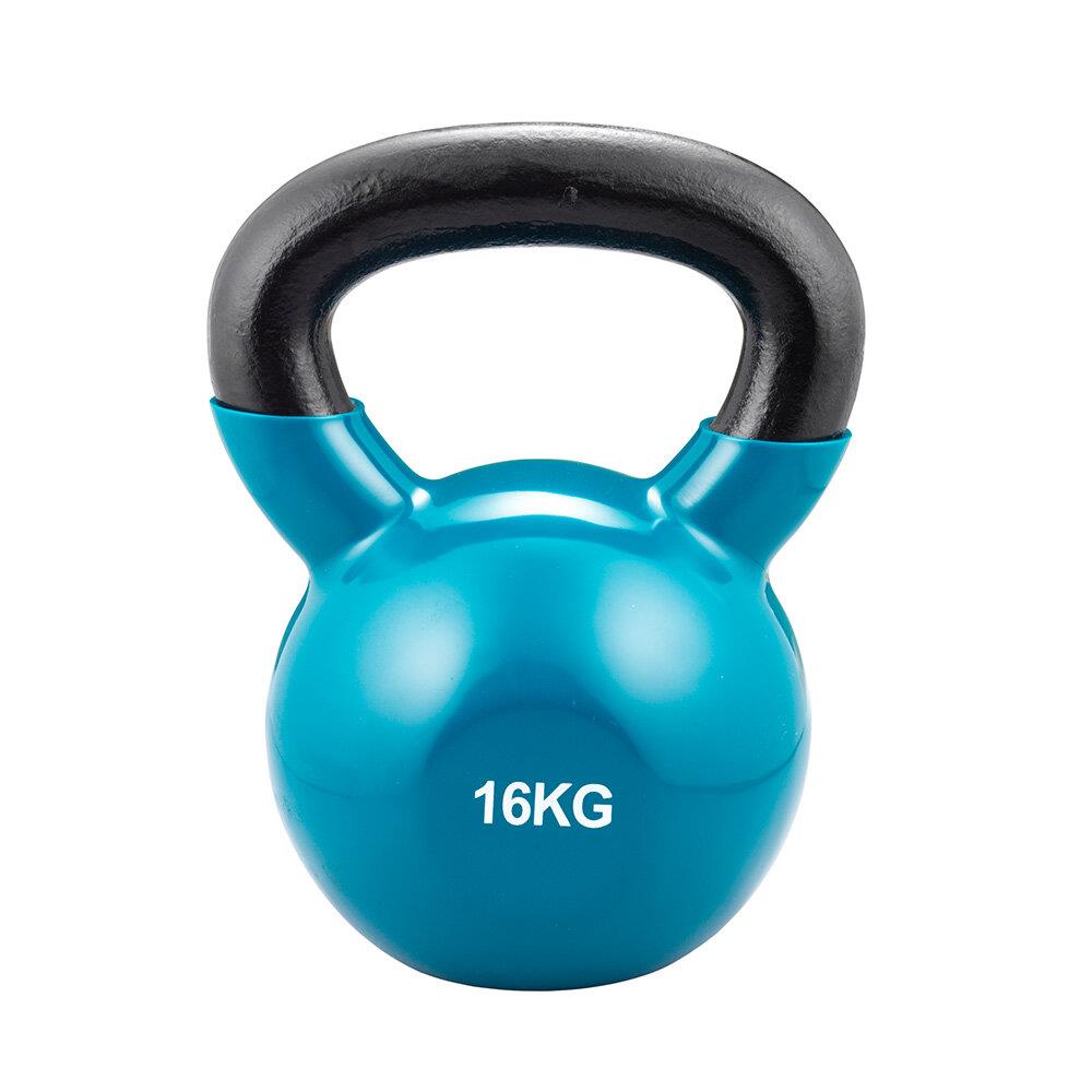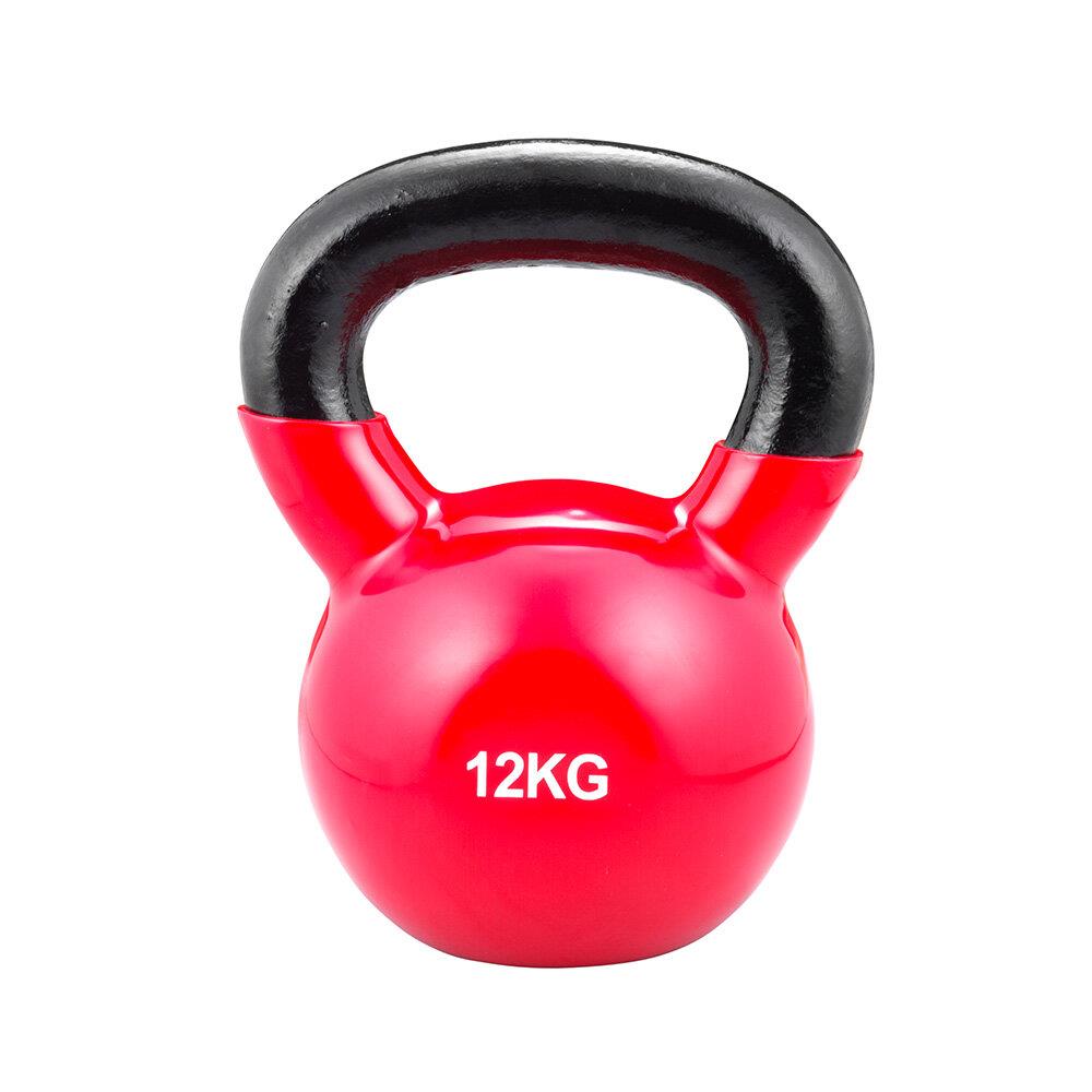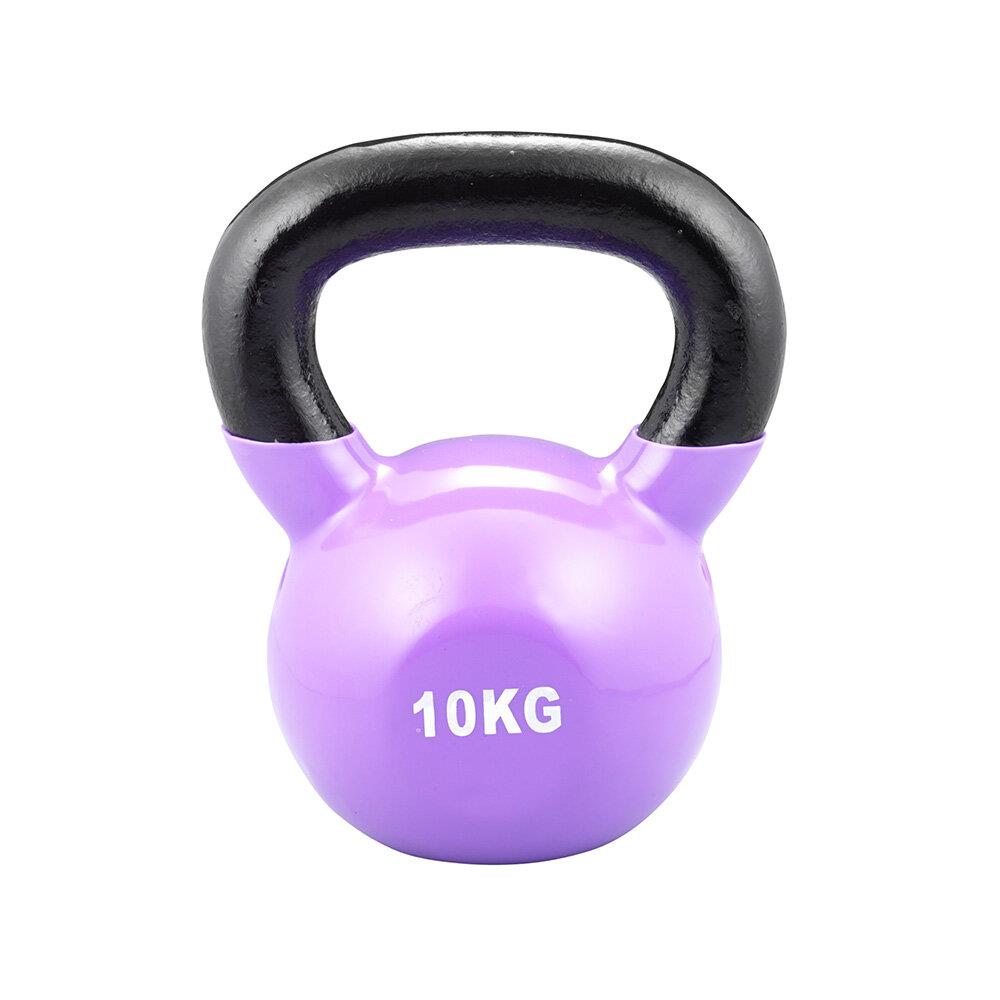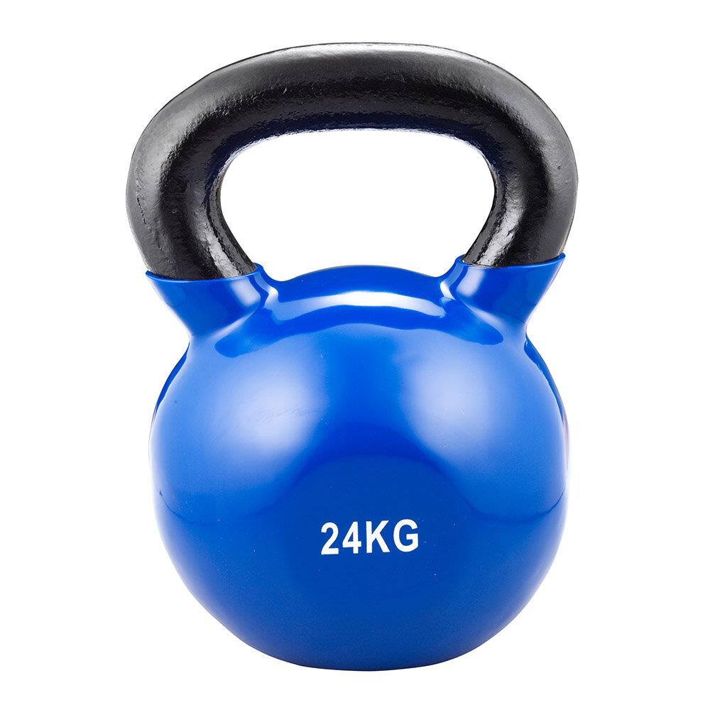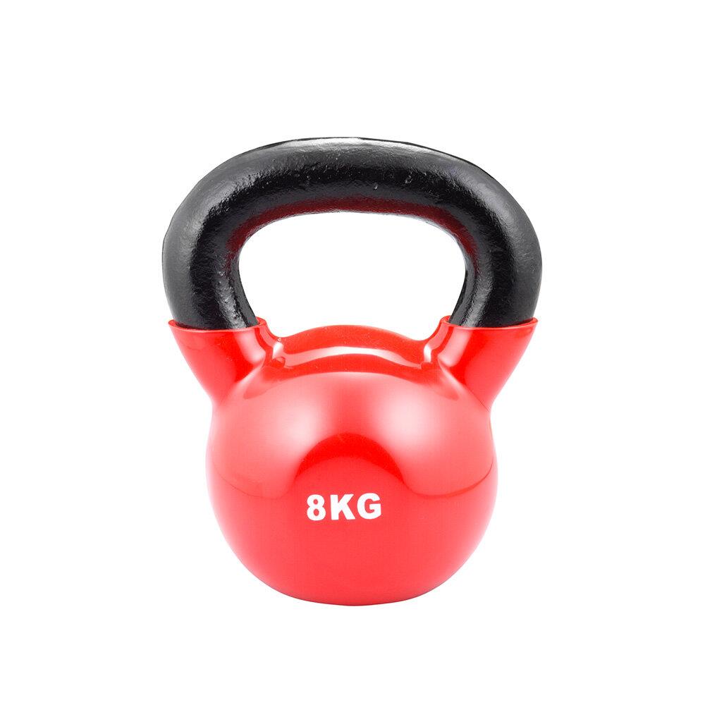 Kettlebell en vinyle avec noyau en fer et poignée noire. Disponible en 4-32kg pour un entraînement progressif. Parfait pour les exercices de force et de coordination.